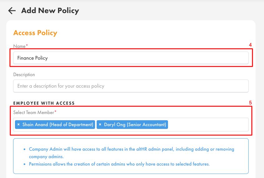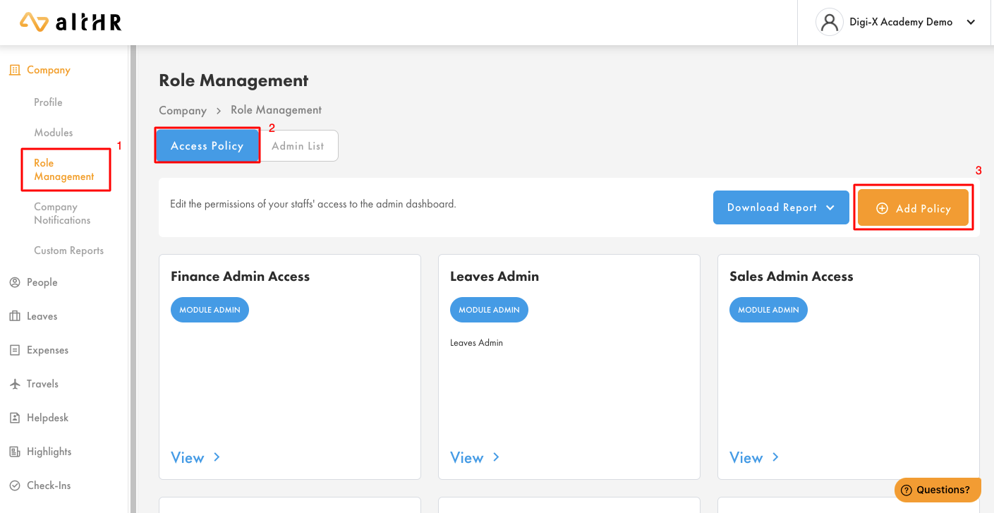 Follow the steps below to create an access policy and assign module permissions to employees.