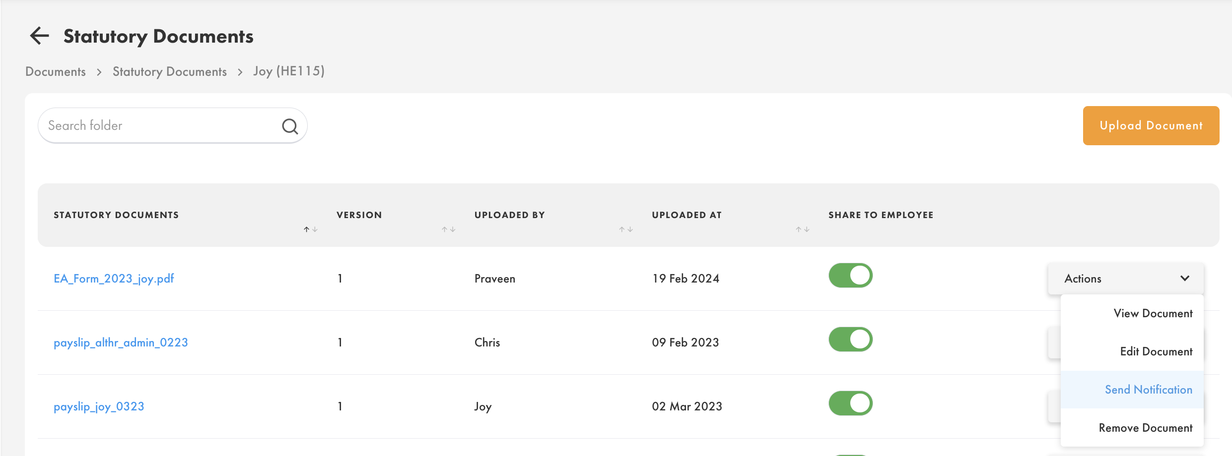 Once the document is uploaded successfully, you may click on Actions: Send Notification to notify the employee of the newly uploaded document.